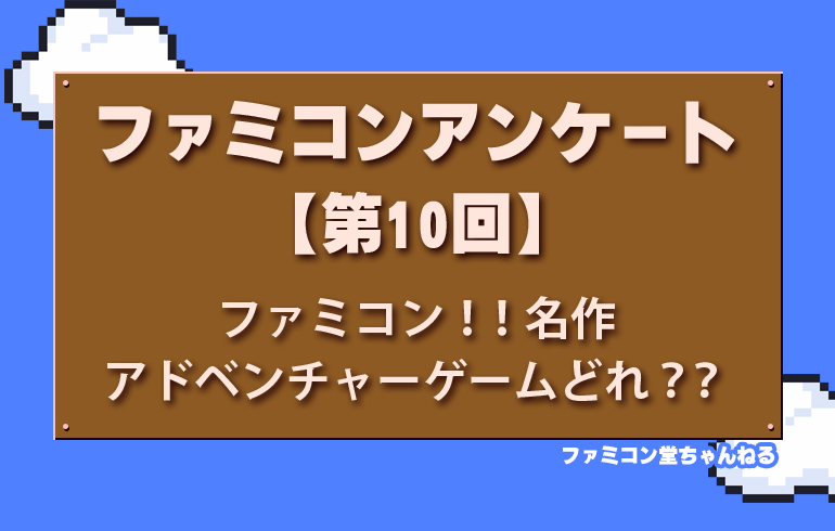 名作アドベンチャーゲームどれ??【第10回】 2025.07.13 アンケート 夜中まで推理して難解な事件の謎を解き明かした あのアドベンチャーゲーム あなたが心から愛する一作に ぜひ1票を! 「このミステリーがたまらない!」「推理のドキドキが蘇る!」 あなたの熱い想いをコメントでも聞かせてね🔥 ポートピア 連続殺人事件 探偵 神宮寺三郎 さんまの名探偵 オホーツクに 消ゆ もしもリメイクされるなら…あなたはどれを選ぶ!?【第9回】 前の記事 熱狂!二人同時プレイ ファミコンはどれ??【第11回】 次の記事 関連記事 アンケート ディスクシステムやツインファミコンを使ってましたか?【第25回】 アンケート もし続編があったら気になって仕方ないソフトはどれ?【第78回】 アンケート 記憶に残る攻略本、ある?【第55回】 アンケート アニメから飛び出した名作ゲーム、あなたの推しはどれ!?【第5回】 コメント 0 コメント 0 トラックバック この記事へのコメントはありません。 トラックバックURL この記事へのトラックバックはありません。 返信をキャンセルする。 名前(例:山田 太郎) E-MAIL - 公開されません - URL