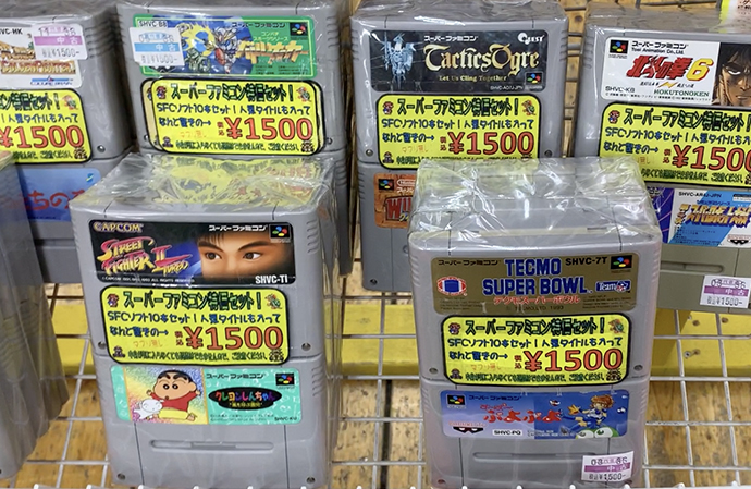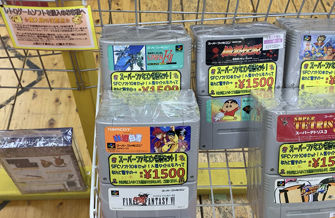 他には、スーパーファミコンソフトの10本入りバラエティーセット(1500~2000円)が売っているのも印象的でした。そのまま福袋などの中身に入れても通用するタイトルがお得な価格でまとめてゲットできるので、非常にお得な商品ですね!