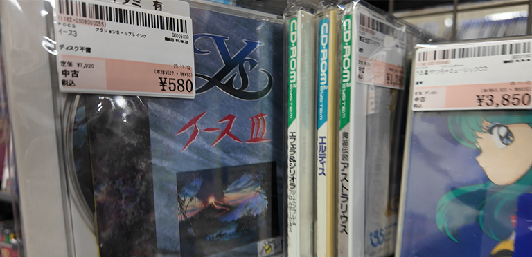 ショーケースの側面にはPCエンジンやCD-ROM²のソフトも並んでいました。ここでは『イースIII』をはじめとするイースシリーズが比較的お手頃価格で並んでおり、思わず手に取りたくなるラインナップ。
