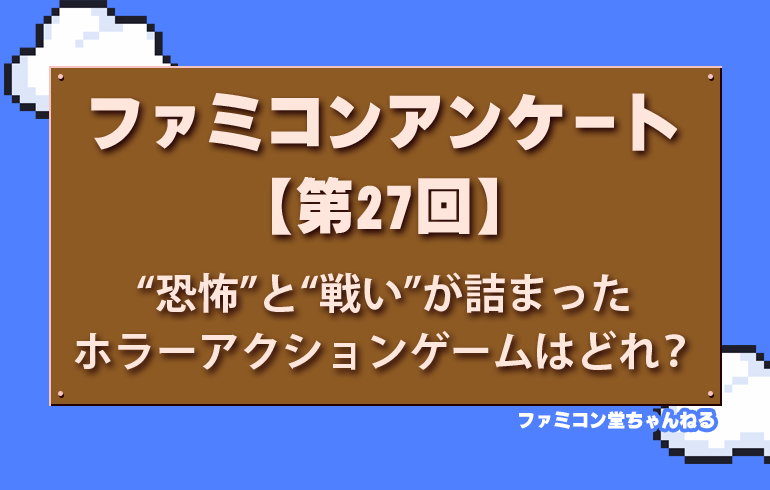 ファミコンの“恐怖”と“戦い”が詰まったホラーアクションゲームはどれ?【第27回】 2025.07.29 アンケート ホラー×アクション特集👻🔥 ファミコンの“恐怖”と“戦い”が詰まったホラーアクションゲームをピックアップ! どれもトラウマ級の難易度と雰囲気! あの頃のドットの恐怖、もう一度味わいましょう。 悪魔城ドラキュラ ジーキル博士の彷魔が刻 魔界村 月風魔伝 あなたが一番「涼しくなれる!」と思うゲームはどれ?【第26回】 前の記事 テンション爆上げBGMはどれ?【第28回】 次の記事 関連記事 アンケート テンション爆上げBGMはどれ?【第28回】 アンケート 光る!発光ダイオード付きゲームの世界【第60回】 アンケート あなたにとって最強の敵はどれ??【第84回】 アンケート ファミコンコナミアクションゲームといえばこれだ!!!【第75回】 コメント 0 コメント 0 トラックバック この記事へのコメントはありません。 トラックバックURL この記事へのトラックバックはありません。 返信をキャンセルする。 名前(例:山田 太郎) E-MAIL - 公開されません - URL
