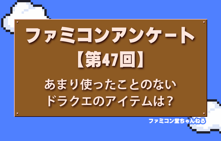 あまり使ったことのないドラクエのアイテムは?【第47回】 2025.08.07 アンケート “あまり使ったことのないドラクエのアイテム” はどれ!? 序盤でもらったけど、気づけば袋の中でホコリをかぶってた…? 「存在は知ってるけど、実際いつ使うの?」なんてアイテム、ありましたよね あなたが“スルーしがちだった”ドラクエアイテムを教えてください! よかったら使わなかった理由や、逆に意外な活用法もあればコメントで教えてくださーい あの頃の冒険の“裏アイテム事情”、掘り起こそう!😃 せいすい りゅうのうろこ まよけのすず においぶくろ 3Dダンジョン ゲームといえばどれ!?【第46回】 前の記事 ハマったパズルアクションゲーム はどれ!?【第48回】 次の記事 関連記事 アンケート 福袋…入っていたらちょっとうれしいゲームってどれ?【第71回】 アンケート ハマったパズルアクションゲーム はどれ!?【第48回】 アンケート あなたの思い出のファミコン周辺機器はどれ?【第61回】 アンケート ファミコンでドハマりした対戦ゲーム、覚えてる?【第35回】 コメント 0 コメント 0 トラックバック この記事へのコメントはありません。 トラックバックURL この記事へのトラックバックはありません。 返信をキャンセルする。 名前(例:山田 太郎) E-MAIL - 公開されません - URL