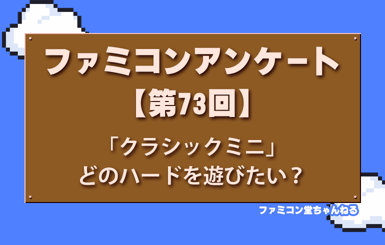 「クラシックミニ」が出るとしたら……どのハードを遊びたい?【第73回】 2025.09.05 アンケート もし次に「クラシックミニ」が出るとしたら……どのハードを遊びたい? あの頃のワクワクをもう一度、小さな筐体で味わいたくありませんか? コメントで「このゲームが入ってたら最高!」っていう思い出も教えてくださーい スーパーカセットビジョン セガマーク3 MSX ディスクシステム あなたがおすすめするレトロゲームショップはどこ?【第72回】 前の記事 ぜひ出してほしい2はどれ??【第74回】 次の記事 関連記事 アンケート もしもリメイクされるなら…あなたはどれを選ぶ!?【第9回】 アンケート ミュージシャンゲーム選ぶなら…どれ?【第81回】 アンケート ファミコン向けのスティックコントローラーといえば??【第32回】 アンケート ファミコンの“恐怖”と“戦い”が詰まったホラーアクションゲームはどれ?【第27回】 コメント 0 コメント 0 トラックバック この記事へのコメントはありません。 トラックバックURL この記事へのトラックバックはありません。 返信をキャンセルする。 名前(例:山田 太郎) E-MAIL - 公開されません - URL