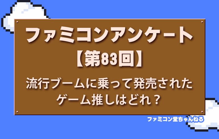 当時流行ブームに乗って発売されたゲーム、推しはどれ?【第83回】 2025.09.23 アンケート 当時の流行ブームに乗って発売されたゲーム、 あなたの推しはどれ?🎮✨ スポーツ、映画、芸能、アニメ……とにかく流行してたら何でもゲーム化されちゃったあの時代! 中には名作もあれば、思わず首をかしげる迷作も…😂 霊幻道士 テトリス ファミリージョッキー つっぱり大相撲 ナムコの黎明期といえばこのゲーム!!【第82回】 前の記事 あなたにとって最強の敵はどれ??【第84回】 次の記事 関連記事 アンケート これは、💩ゲーじゃないゲームはどれ!?【第64回】 アンケート あなたの“推し忍者ゲーム”はどれ!?🥷【第23回】 アンケート ファミコン後期(90年代) オススメ名作ゲームは?【第94回】 アンケート 任天堂のおすすめシリーズといえばどれ!?【第39回】 コメント 0 コメント 0 トラックバック この記事へのコメントはありません。 トラックバックURL この記事へのトラックバックはありません。 返信をキャンセルする。 名前(例:山田 太郎) E-MAIL - 公開されません - URL