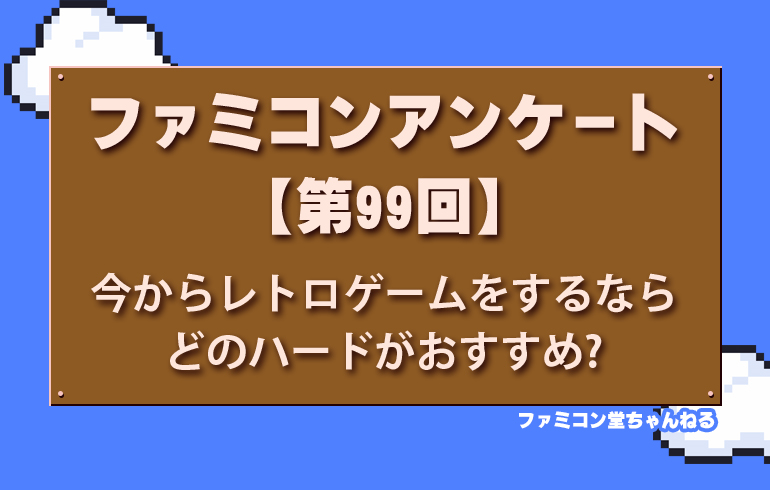 今からレトロゲームをするならどのハードがおすすめ?【第99回】 2025.09.24 アンケート 今からレトロゲームをするならどのハードがおすすめ 数ある名機のなかで「いま改めて遊ぶならコレ!」ってハードはどれでしょうか? あの頃のワクワクをもう一度味わいたい! あなたの“推しハード”をぜひコメントで教えてください😊 ファミコン スーパーファミコン メガドライブ PCエンジン このなかでどのマリオゲーがすき?【第98回】 前の記事 やっぱりファミコンは好きですか?【第100回】 次の記事 関連記事 アンケート ハドソンといえばこのゲーム!【第52回】 アンケート 剣をビュンビュン振り回す!そんなゲームといえば?【第89回】 アンケート あなたの推しRPGはどれ!?【第42回】 アンケート 好きな「🤖ロボット ↔️ ✈️ 飛行機 変形ゲーム」はどれ?【第67回】 コメント 0 コメント 0 トラックバック この記事へのコメントはありません。 トラックバックURL この記事へのトラックバックはありません。 返信をキャンセルする。 名前(例:山田 太郎) E-MAIL - 公開されません - URL
